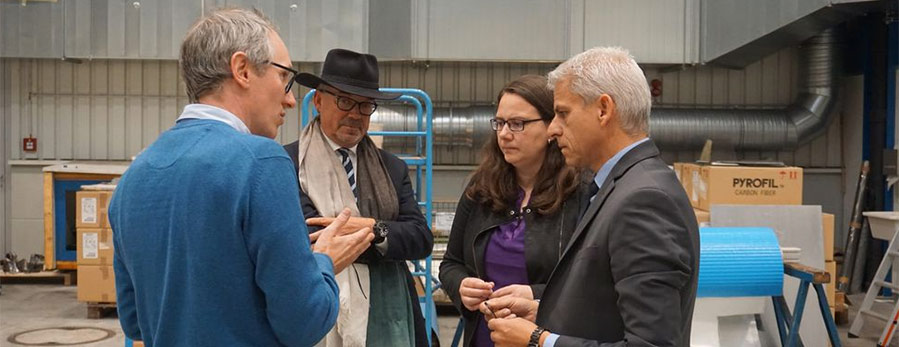 A visit to the Composite Systems Division's technical centre was also made on site. Here DORNIER develops and builds modern plants for the production of fibre composites. The lightweight components, which are produced on the machines by hidden champions all over the world, some of them highly specialized, can be found in aircraft and high-performance passenger cars. In the medium term, the traditional automotive supply industry could also use these machines for large-scale production. "Automotive suppliers could use them to mass-produce fibre composite components on demand for OEMs or TIERs – with the desired geometry, the right mix of fibres and matrix, and individual mechanical properties," said Dr Josef Klingele, head of the Composite Systems product line, during the tour. Because electric cars require fewer precision parts made of metal than petrol cars, Klingele said, capacities are freed up at medium-sized suppliers – these could be absorbed by the production of fibre composite components. "An automotive supplier that today turns injection nozzles or lasers sheet metal parts could in future increasingly produce fibre composite components on our systems," stated Klingele. This would preserve the distribution that has proven itself over decades: OEMs produce the large-scale series, while medium-sized companies with an affinity for development optimise the car components in terms of geometry, performance and costs. "Whether it's an electric car, a transport drone or a flying taxi – with our machines and systems we want to enable suppliers to creatively produce lightweight applications using standardised materials" said Klingele.