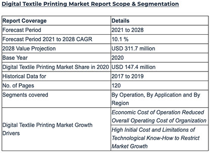 According to Fortune Business Insights, the global digital textile printing market size is projected to grow from USD 147.4 million in 2020 to USD 311.7 million by 2028 at CAGR of 10.1% during forecast period; Virtual fabric printing render accessibility to drive market growth: Fortune Business Insights